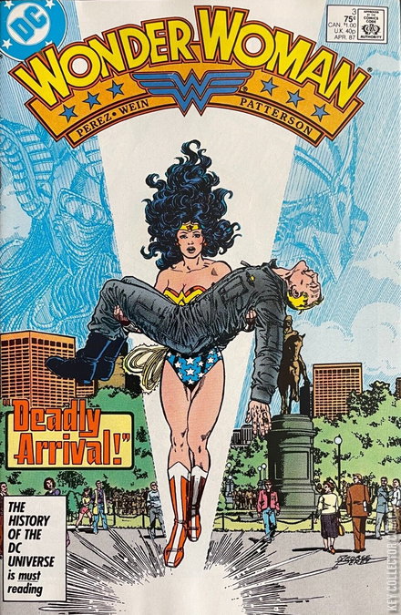 DEADLY ARRIVAL! The new adventures of Wonder Woman under the stewardship of George Pérez continue! Diana meets Julia Kapatelis, who helps the Amazon warrior better adjust to Man's World.