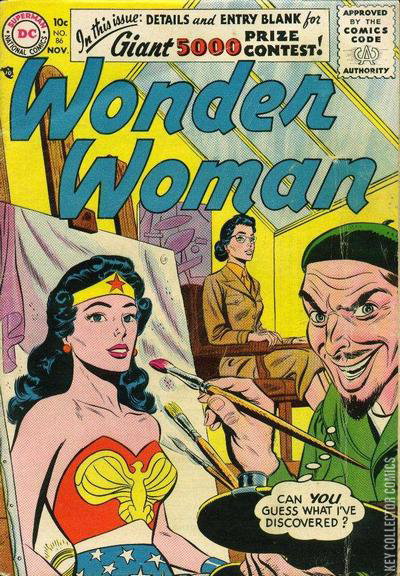 1. The Sword in the Sky! (Wonder Woman, Steve Trevor / written by Robert Kanigher, drawn by Harry Peter, lettered by Jim and Margaret Wrotten) 2. The Wooden Hero! (Wonder Woman / written by Robert Kanigher, drawn by Harry Peter, lettered by Jim and Margaret Wrotten) 3. The Woman in the Bottle! (Wonder Woman / written by Robert Kanigher, drawn by Harry Peter, lettered by Jim and Margaret Wrotten)