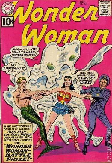 Wonder Woman is wooed by Mer-Man and Steve Trevor before falling for a shapeshifting alien posing as Sir Gallahad.