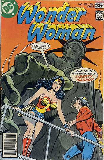 The Golden Age Flash takes down a German spy ring. Pointing out that she was perfectly capable of handling the spy ring alone, the Golden Age Wonder Woman is actually borderline furious with the Golden Age Flash for offering his assistance. Her anger quickly escalates, as she dresses the Golden Age Flash down for treating her as less than an equal. The Golden Age Wonder Woman storms off, leaving the Golden Age Flash to ponder her rant. The Golden Age Wonder Woman resumes her Diana Prince identity, and returns to her hotel room. She arrives just as her friend, Etta Candy, is being ushered out on a date by Lieutenant Marchand, a member of the Free French Army. Meanwhile, General Blankenship is showing Major Steve Trevor several photographs of the Golden Age Wonder Woman.The pictures show the Golden Age Wonder Woman attacking American soldiers, destroying American military equipment, and protecting Japanese soldiers against Allied Forces. Ever since Trevor was hospitalized, the Golden Age Wonder Woman has, seemingly, turned against the United States of America. The stress of the accusations against the Golden Age Wonder Woman prove to much for Trevor. As he collapses, his replacement in Military Intelligence, Colonel Belushi, goes to get a doctor for him. At that moment, on the planet Mars, the Roman God the planet is named for bellows in rage over the Golden Age Wonder Woman's constant interference in his schemes. His advisor, the Duke of Deception, points out that the Golden Age Wonder Woman has fallen out of favor with the American military.The Duke of Deception offers his services in deepening the rift, while stoking the military's growing resentment towards the Golden Age Wonder Woman. The God of War approves, opening a portal to Earth for the Duke of Deception. The Golden Age Flash, as Jay Garrick, his civilian identity, meets with Prince to clear the air between them. After reaching an amicable accord, the two prepare to dine together, when Prince sees the Statue...