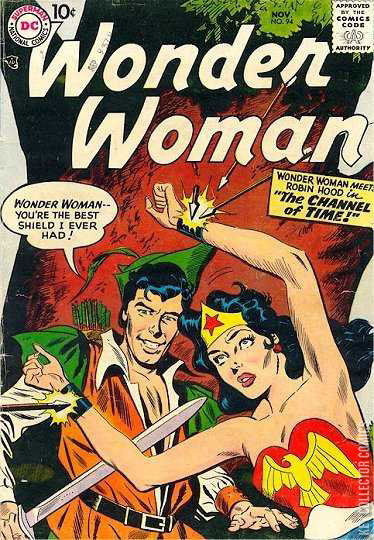 1. The Amazing Movie Camera (Wonder Woman / written by Robert Kanigher, drawn by Harry Peter) 2. Target: Wonder Woman (Wonder Woman, Duke of Deception, Steve Trevor / written by Robert Kanigher, drawn by Harry Peter) 3. The Channel of Time (Wonder Woman, Robin Hood, Prince John / written by Robert Kanigher, drawn by Harry Peter)