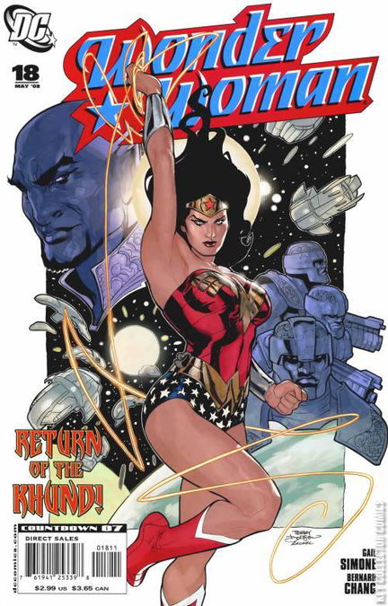 Comics superstar Bernard Chang joins Gail Simone for a 2-part story that will take Wonder Woman to the furthest reaches of the galaxy, but not before the vicious alien race the Khund begin an assault on Earth! But before the invasion can begin, the relationship of Wonder Woman and Nemesis takes a defining turn.Wonder Woman visits Tom Tressor/Nemesis in the hospital after the whole incident involving the poison. She gives him a nectarine pit and a ribbon with thorns on it. She then is bombarded by many fans when one of the ladies that run the front desk pulls out her out and Diana makes her way outside. And spots an invasion. The Khunds invade and he calls out a scroll which declares their invasion. She asks if this is an invasion against her country or her planet, and the Khund reading...
