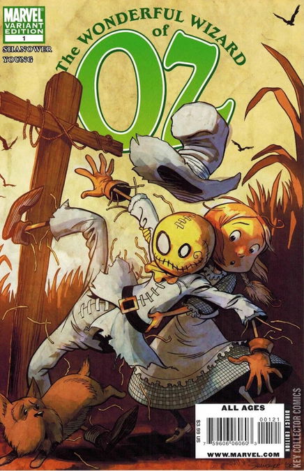 The premiere American fantasy adventure gets the Merry Marvel treatment! Eisner Award-winning writer/artist Eric Shanower (Age of Bronze) teams up with fan-favorite artist Skottie Young (New X-Men) to bring L. Frank Baum's beloved classic to life! When Kansas farm girl Dorothy flies away to the magical Land of Oz, she fatally flattens a Wicked Witch, liberates a living Scarecrow and is hailed by the Munchkin people as a great sorceress…but all she really wants to know is: how does she get home?