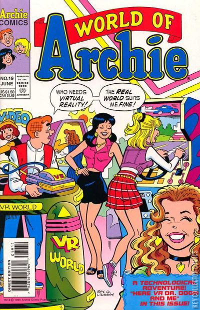 Featured Story: "Here VR, Dr. Doom & Me!" (Bolling, Lindsey). Time Travelers, giant '90's VR contraptions, and Riverdale's finest teenagers collide in this feature. Additional Stories: "Classic TeeVee" (Lindsey). Classic TV shows re-imagined with Archie as the star. "History of Arch" (Doyle, Lindsey, Grossman). A brief history of Archie and his friends (and Reggie) for new readers.