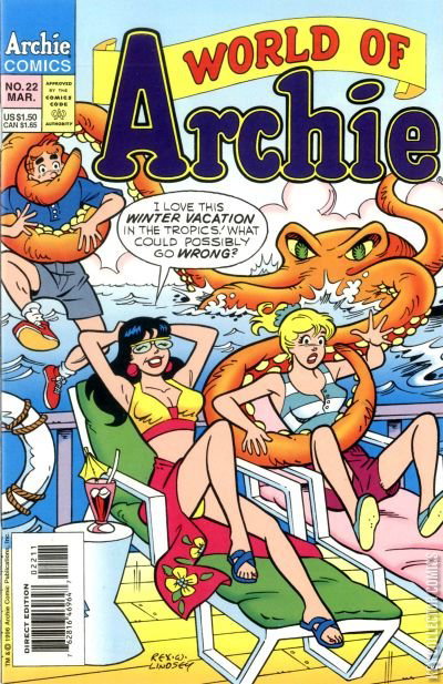Featured Story: "So How Was Your Vacation?" (Bolling, Lindsey). Archie, Betty, and Veronica sail north to try out Mr. Lodge's new project, The Berg Buster. Additional Story: "Love & Learn" (Lifson, Lindsey). Archie gets mad when Veronica goes on The Phil Dynamo Show and reveals she's dissapointed in his level of romanticism.