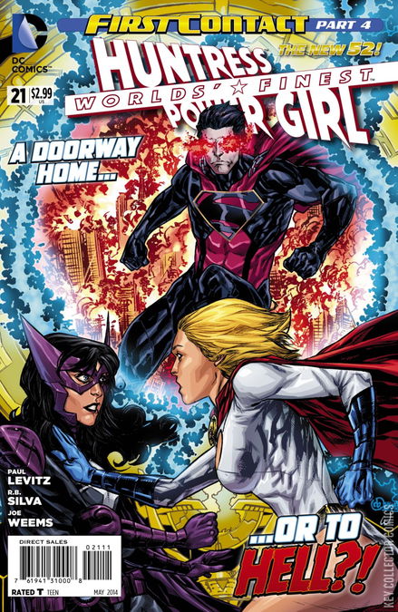 FIRST CONTACT PART 4 Having allowed Kaizen Gamorra to re-open the portal to Earth 2, Power Girl is eager to cross over, despite the fact that everyone present can see that the other world is being destroyed by a dangerous force that could push through to this one at any moment. Kara's friend Huntress is less eager to take such a big risk. Kaizen Gamorra's reasons for opening the portal are much different from Kara's reasons for wanting him to, though, as he has heard the seductive promises of Darkseid, offering power. Ignoring him, Kara tries to push through the portal, but Helena gets in her way. At last, Kara decides it would be best to test what's on the other side of the portal by throwing Kaizen Gamorra through it. Even though the portal remains open to them, Helena is suspicious of just how Kaizen Gamorra found the technology on this earth to open the way to another. Even so, because Kara is so set on passing through, she intends to stick by her. However, as they prepare to enter the portal, a massive fist passes through from the other side. Kaizen Gamorra emerges, significantly empowered, explaining that his master wants Kara because he loves her. Confused, Kara watches as the creature is followed by her real cousin - the Superman of Earth 2. He unleashes Parademons to distract the others, and they realize soon that there must be a connection between the corruption of that world's Superman and Darkseid. Kara, though, is not so easily deterred. She is so strongly tempted that she approaches the portal, and Helena takes it upon herself to destroy it with an explosive. Angrily, Kara turns on her, explaining that there was no illusion about it. She had seen her real cousin on the other side of that portal, and Helena had destroyed their ticket home. As they sit sadly in the wreckage, Batman and Superman admit that they should take their leave, expressing their sympathies. Meanwhile, on Earth 2, Superman punishes Kaizen for his failure.