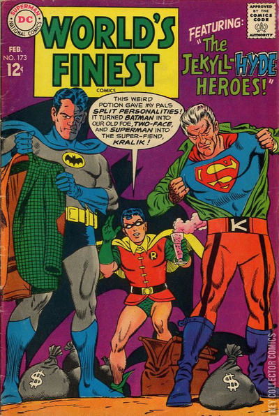 The Jekyll-Hyde Heroes (Superman, Batman and Robin / written by Jim Shooter) The evil Dr. Aaron uses his "Psyche-Distortor" chemicals to turn the heroes into people they fear the most : Batman into Two-Face and Superman into Kralik! The two new villains rampage Metropolis. Can Robin save the day? Or will someone else defeat the mad scientist? The Super-Key to Fort Superman (Editors' Round Table choice / written by Jerry Coleman : reprinted from: Action Comics #241)