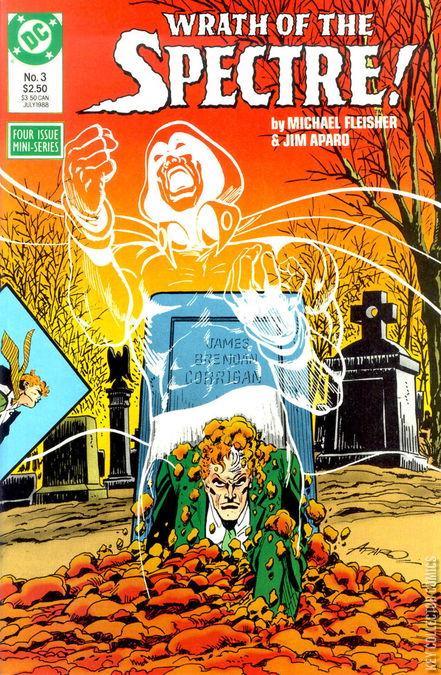 This issue presents four reprinted stories which originally appeared in four different issues of Adventure Comics. The first story in this issue originally appeared in Adventure Comics issues 437 (“The Human Bombs and the Spectre” 1975). The story opens with New York City Police Detective Lieutenant Jim Corrigan dropping by a Manhattan television show room. While pondering the purchase of a new TV, Corrigan hears a report that Gwen Sterling was kidnapped. He returns to the police station asks his captain for permission to leave the homicide division temporarily so that he can hunt for Gwen. The captain grants Corrigan's request. At an abandoned bauxite mill in upstate New York, the kidnappers deliver Gwen to a mad scientist. The kidnappers ask for their money for kidnapping Gwen, the last person on the scientist's list; instead, the mad scientist directs their attention to a stroboscopic hyno-wheel. He hypnotizes them and orders them to jump into a water tank where barricuda feed on the henchmen. The mad scientist then hypnotizes the seven people he kidnapped and orders them to carry bombs to banks and jewelry stores for robberies. The first kidnapping victim, Mr. Vanderhaven, is unable to take money away from the bank, so he pushes the bomb’s button and destroys himself and the people who tried to stop him. After the first demonstration of the bomb’s effectiveness, the six other kidnapped and hypnotized victims are able to obtain money and jewelry without resistance from the employees. After a few days, a hypnotized Gwen arrives at Tiffany’s Jewelry Store and demands jewels. The police have established a telephone hotline by this time whenever a human bomb attempts to rob a business, so Corrigan is able to drive quickly to the robbery scene before Gwen leaves. He realizes Gwen is in a trance, so he lets her take his car. Then, as the Spectre, he follows her to the mad scientist’s hideout. Inside the abandoned mine, the Spectre emerges from the... Includes a discussion of the negative reactions to these Spectre stories, including the revelation from Paul Levitz that at the time it was mostly from in-house professionals. Wrap-around cover