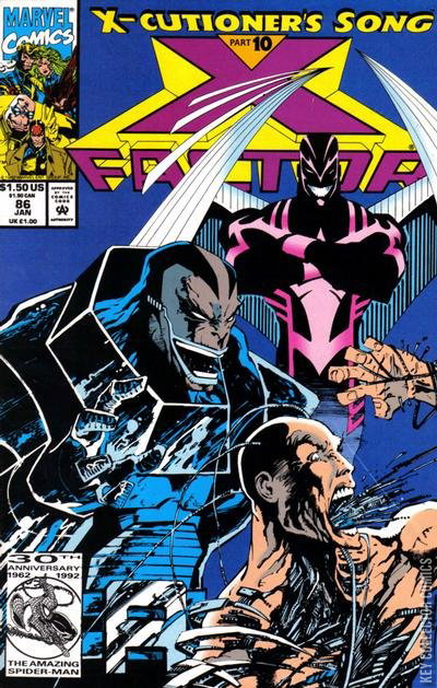 Continued from Uncanny X-Men #296. Cyclops and Jean Grey have escaped Stryfe's base and realize they're on the moon and can't breathe. Stryfe saves them.Wolverine, having received a psionic distress signal from Jean Grey, tells the X-Men and X-Factor that she and Cyclops are on the moon. Cable, Bishop, and Wolverine prep themselves to go to the moon on their own. Upon arrival at the base, they run into the Dark Riders and some of Stryfe's troops.Havok assembles a team of X-Men, Polaris, and Cannonball to go to the moon. Madrox lets Havok know the dupe that was watching the X-Patriots was missing. The dupe later awakens in the hospital. Havok chooses to lie to Valerie Cooper about the X-Patriots escaping.Archangel lets Apocalypse out of the cell he was being detained in to try and save...
