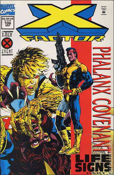 Phalanx Covenant Part 1. Double-Sized Issue. "Life Signs!" Guest-starring Professor X, X-Force, and Excalibur. X-Factor is invited to mutant signature dampening building in France. Their they get filled in on the Phalanx and the threat to mutantkind. Rahne and Cannonball discover the being known as Douglock, an entity with characteristics of two old friends, Doug Ramsey and Warlock. This being, however, has an agenda and kidnaps Cannonball, Rahne, and Forge in order to stop Babel. Story continued in X-Force #38. Note: Issue includes a team-up pin-up of the three X-Teams involved.