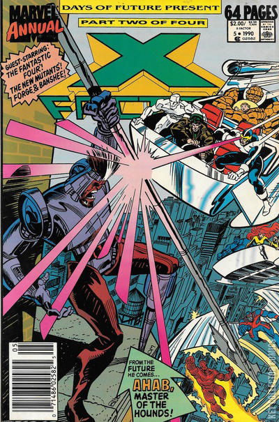 "Act of Faith (Days of Future Present Pt. 3)" Continued from New Mutants Annual #6. Franklin Richards is still loose and the Fantastic Four is still tracking him. They team up with X-Factor just in time to see Rachel Summers collide with the older Franklin. She's not as he remembered her and once again vanishes. This leaves Rachel in the position to introduce herself to her mother, Jean Grey. Yet Rachel is not accepted, partly out of shock and partly out of the fact that Rachel appears to be one of Ahab's hounds. Ahab confirms this, but the Phoenix Force wins control and Rachel flees. The New Mutants arrive just in time, as Ahab has unleashed a horde of hounds. The machinery is found that controls Ahab's time traveling and a team of mutants destroys it. Despite the victory, older Franklin returns and takes something most precious to Cyclops. This story arc concludes in X-Men Annual #14. "Tribute the First" A familiar looking visitor to Jean Grey's grave has a candid conversation with an elderly woman about finding one's identity. Two art pieces are included at the end of this issue: one with Beast and Marvel Girl and another as a preview of the X-Factor special issue "Prisoner of Love."