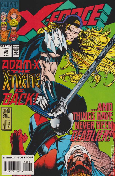 After fighting, Shatterstar and X-Treme team up to take down Arcade. Juggernaut and Black Tom are back in Ireland, just in time for Siryn to make a visit. Domino arrives at Camp Verde to help reunite X-Force.Notes:X-Treme and Shatterstar first met in X-Force Annual #2.Also, Mr. Milbury was supposed to be Mr. Sinister, but this storyline was never furthered. (Adam X was supposed to be a rumored third Summers brother, something Sinister would be very interested in knowing.)On page 26, Windsong is speaking but the picture is colored to look like it is Ms. Locke, which gives the impression that Ms. Locke is speaking to control Windsong. This is not the case; it's just the wrong coloring.SynopsisShatterstar and Adam X are engaged in a heated battle. Neither man wants to fight, as each esteems the other as solid warrior. Adam X feels he is fighting for a greater cause: a woman's life is on the line if he doesn't kill Shatterstar. He draws Shatterstar's blood and uses his mutant powers to ignite the electrolytes in his blood. Adam X turns to a video camera and tells Arcade that he refuses kill Shatterstar and demands that Arcade tell him the name of the contractor who wants him killed. Arcade refuses. Shatterstar awakens and Arcade instead shows the person he is hanging over Adam X's head: Windsong, a woman from Shatterstar's homeworld. Everyone is surprised to find that Windsong is Shatterstar's wife.At Camp Verde, Cable finally gets an answer from Tempo: she won't join his team. She won't join any team. Tempo decides that she's had it with the superpowers game and departs to finish college. As she leaves, Domino drives up in a jeep.In one of the bunkers, Siryn tries to clean up the mess she recently made while drunk. Warpath joins her and reaffirms his feelings for her, but also lays the foundation as just being her friend. Siryn admits that she is touched but that she really needs to get away. She invites Warpath to her home in Ireland. He is overjoyed. Meanwhile, Black...