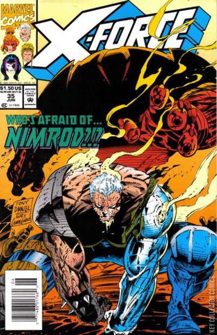 X-Force finds out about a government project to create advanced artificial intelligence the likes of which weren't supposed to be seen until the future. Siryn asks Banshee for information on Nimrod. Cable lets Forge and X-Factor know about whats happening. After some reconnaissance, X-Force break into a facility at Camp Hayden to thwart the project and are quickly defeated by an awakened Nimrod. Note: There is an error on page 15. In a discussion about Siryn's run-in with Black Tom, as well as about X-Force stealing files from the X-Men, an asterisk points the reader to X-Force #19, as if both events happened in the same book. In truth, X-Force stole the files in #19 while Siryn met with Black Tom in #31.