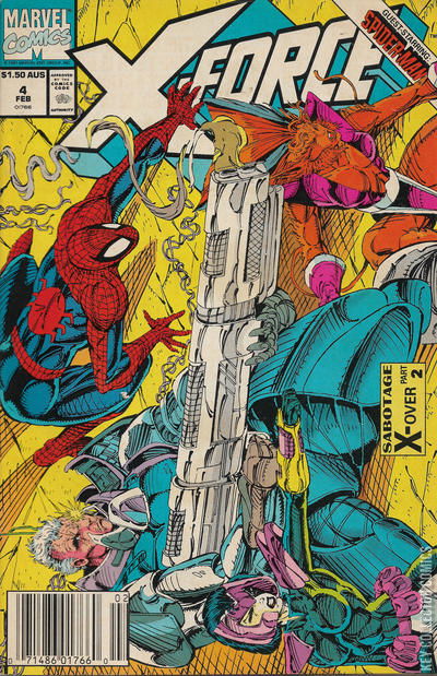 "Sabotage: Part 2" X-Force and Spidey take down Juggernaut and Black Tom but then have to escape from Bridge; sideways Issue. Continues from Spider-Man #16. Two-page pinup by Mike Mignola.