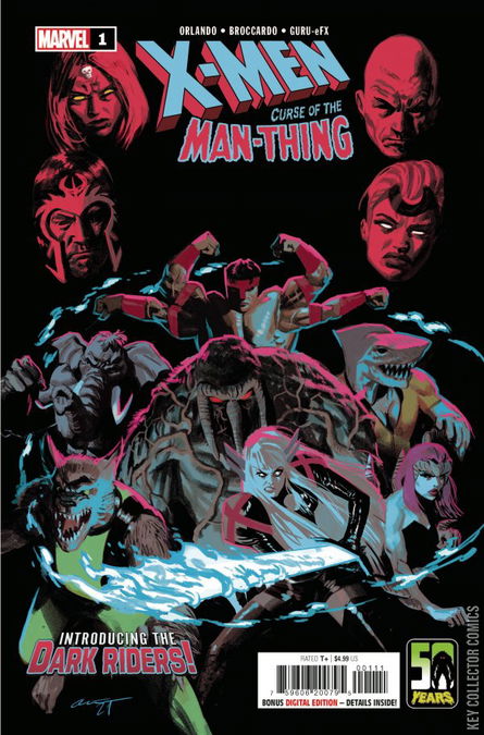 DEVILS AND DARK ROOMS Man-Thing’s tragic curse has finally been revealed…but it’s under new management! Years ago, Dr. Ted Sallis was ready to give up anything to crack the SO-2 serum and deliver success to his growing family. Unbeknownst to the rest of the world...he did. Today, as cities spanning from the U.S. to Krakoa are besieged by fear-driven blazes, the Man-Thing must reckon with his past deeds if he hopes to emerge renewed and rescue a world on fire. But fighting from his lowest means that Man-Thing can rise to his highest, especially with the unexpected help of the X-Men’s resident sorceress Magik and her debuting team of monstrous mutants known as THE DARK RIDERS! Magik will lead one of the most eclectic group of mutants ever assembled, a fearsome mix of fan-favorites and obscure delights: Marrow, Forearm, Shark-Girl, Wolf Cub, and Mammomax!