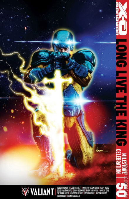 IT’S HERE! THE GREATEST VALIANT MILESTONE OF ALL TIME! 64 MASSIVE PAGES! For centuries, the sacred X-O Manowar armor has stood unrivaled as the universe’s most powerful weapon. Today, will it equal Earth’s doom? An unthinkable alien race known only as The Torment has come to our world in search of the armor’s secrets. Now, they stand opposed by Aric of Dacia – former slave, noble warrior, resolute king, and current master of the armor’s near-limitless capabilities. But is one man…and one weapon…enough to repel a force capable of leveling a thousand civilizations? A whole new era for X-O Manowar begins here…and you won’t believe what’s coming next! From all corners, the Valiant Universe assembles to salute X-O Manowar’s unparalleled 56-issue run as Robert Venditti, Joe Bennett, and Roberto de la Torre declare “LONG LIVE THE KING” with an oversized series finale for the ages! Plus: all-new, never-before-seen X-O Manowar tales and tributes from Jody Houser & Javier Pulido, Matt Kindt & Tomas Giorello, and Philip Tan, and special guest appearances from X-O Manowar’s own Cary Nord, Diego Bernard, Rafa Sandoval, Robert Gill, and more!