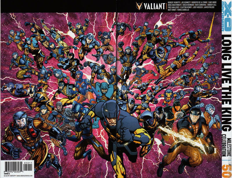 IT’S HERE! THE GREATEST VALIANT MILESTONE OF ALL TIME! 64 MASSIVE PAGES! For centuries, the sacred X-O Manowar armor has stood unrivaled as the universe’s most powerful weapon. Today, will it equal Earth’s doom? An unthinkable alien race known only as The Torment has come to our world in search of the armor’s secrets. Now, they stand opposed by Aric of Dacia – former slave, noble warrior, resolute king, and current master of the armor’s near-limitless capabilities. But is one man…and one weapon…enough to repel a force capable of leveling a thousand civilizations? A whole new era for X-O Manowar begins here…and you won’t believe what’s coming next! From all corners, the Valiant Universe assembles to salute X-O Manowar’s unparalleled 56-issue run as Robert Venditti, Joe Bennett, and Roberto de la Torre declare “LONG LIVE THE KING” with an oversized series finale for the ages! Plus: all-new, never-before-seen X-O Manowar tales and tributes from Jody Houser & Javier Pulido, Matt Kindt & Tomas Giorello, and Philip Tan, and special guest appearances from X-O Manowar’s own Cary Nord, Diego Bernard, Rafa Sandoval, Robert Gill, and more!