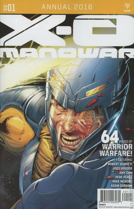 Join the adventures of Valiant’s flagship hero here with 64-pages of armor-busting action on the front lines of the Valiant Universe in X-O Manowar’s first-ever annual! 2016 is primed and ready to be X-O Manowar’s most pivotal year yet! But before Aric of Dacia can confront the biggest threat Earth has ever faced, he must first reflect on the past…and the outcome of a bloodstained battle on the frontier of the Roman Empire that continues to be felt to this day! Then: X-O Manowar’s sworn enemy, Commander Trill, readies for the war that is to come…by undergoing a life-threatening trial-by-fire that will test every ounce of his intellect and fury. Plus: Col. Jamie Capshaw must singlehandedly defend G.A.T.E from a menace nobody expected… and the Armorines begin an all-new mission at the heart of X-O Manowar’s world! The life and times of the unstoppable X-O Manowar loom large as series mastermind Robert Venditti leads an all-star cast of Valiant’s greatest talents – including Amy Chu (Poison Ivy: Cycle of Life and Death), Adam Gorham (DEAD DROP), Jody Houser (FAITH), Mike McKone (Teen Titans), Pere Perez (ARCHER & ARMSTRONG), and more – into a 64-page epic too gargantuan for a single issue!