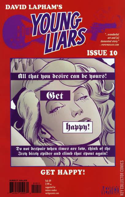 Issue tagline: "Life sucks, kids. But don't ya just love it?" What do a smelly public bathroom, a pregnancy test, a pile of cocaine and a small box with a bow have in common? We could tell you but you might not be able to handle it. Danny could barely take it and you know how twisted he is. This is Big C's life on the wild side. Find out where it all went horribly wrong for the Young Liars right here.