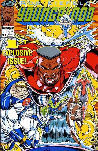 Introducing the next generation of super-heroes...meet Youngblood. This explosive first issue features two teams and two exciting adventures. First Shaft, Die Hard, Bedrock, Vogue, and Chapel must confront the nefarious Four. Then, Sentinel leads Riptide, Brahma, Photon, Psi-Fire, and Cougar into a Middle-Eastern country to put an end to an evil dictator's rule. Brought to you by the co-creator of Cable from the New Mutants and X-Force. 50/50 split with Riptide cover. Flip-book. Two trading cards (they vary per copy of issue?) are bound into the comic.