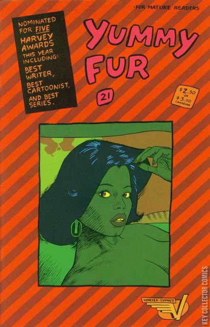 Home / Vortex / Yummy Fur / Yummy Fur #21 Vortex Released June 1990 Yummy Fur #21 Add to Collection Want It Synopsis No synopsis available. Issue 21 of 24 Add to Collection Buy it on eBay Buy on eBay Low $1 Mid $2 High $3 Synopsis No synopsis available. Details Series Yummy Fur Cover Date June 1990 Pages N/A UPC N/A Cover Price N/A Final Order Cutoff N/A Creators No creators listed. Price Guide Log in or subscribe to access detailed graded price information and market insights. Log In Subscribe