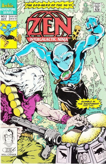 Rumble in the Rainforest, Part 1. Story by Steve Stern. Art by Ross Andru, Mike Esposito and Will Cypser. Cover by Jared K. Fletcher. Archie Comics presents Steve Sterns sci-fi hero as a kid-friendly eco-warrior, featuring art by Silver Age legends Ross Andru and Mike Esposito. Zen and the Recycled Heroes battle Lord Contaminous in the Amazon rainforest, only to find something none of them expected: dinosaurs! This was the final series of Silver Age legend Ross Andru. 36 pages, Full Color.