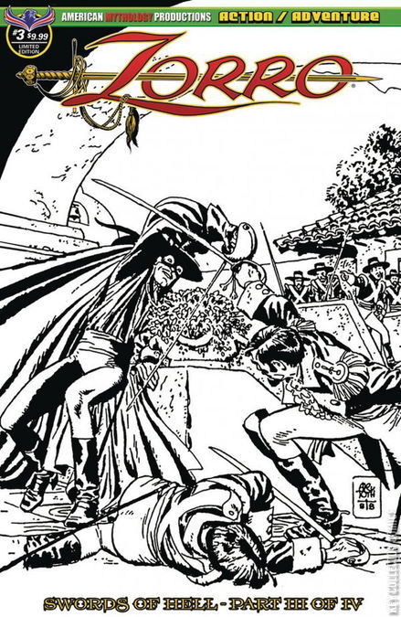A horde of undead demons are sweeping across Alta California, conquering and killing all who stand in their way. Can Zorro stop them? When he learns that cold steel won't be enough, the masked avenger seeks mystical help, tracks down old allies, and unlocks the mysteries of the Swords of Hell! Swords and sorcery, as Zorro fights zombies? brought to you by David Avallone (Bettie Page, Twilight Zone: The Shadow) and Roy Allen Martinez (House of M, Immortal Iron Fist). Zorro Swords of Hell #3 comes with three covers - Main by Roy Allan Martinez, Devils by Moonlight by Jon Pinto, and Visions of Zorro by the legendary Alex Toth.